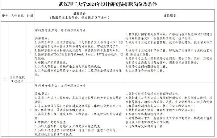 武漢理工大學(xué)是教育部直屬全國(guó)重點(diǎn)大學(xué),是首批列入國(guó)家“211工程”和“雙一流”建設(shè)高校,是教育部和交通運(yùn)輸部等部委共建高校。為促進(jìn)學(xué)校可持續(xù)發(fā)展,加強(qiáng)設(shè)計(jì)研究院專(zhuān)業(yè)技術(shù)隊(duì)伍建設(shè),根據(jù)學(xué)校工作安排,決定公開(kāi)招聘工程技術(shù)人員2名?,F(xiàn)將有關(guān)事項(xiàng)公告如下: