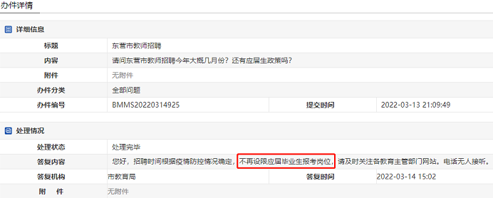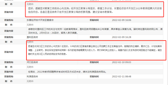 以上,其實在今年2月,東營教師招聘公告發(fā)布時間就初見端倪,各區(qū)縣在政府門戶網站“網上民聲”專欄中分別回復了關于東營教招的消息,其中,經濟技術開發(fā)區(qū)在回復中表示:“東營經濟技術開發(fā)區(qū)2022年教師招聘大約安排在四月份。”